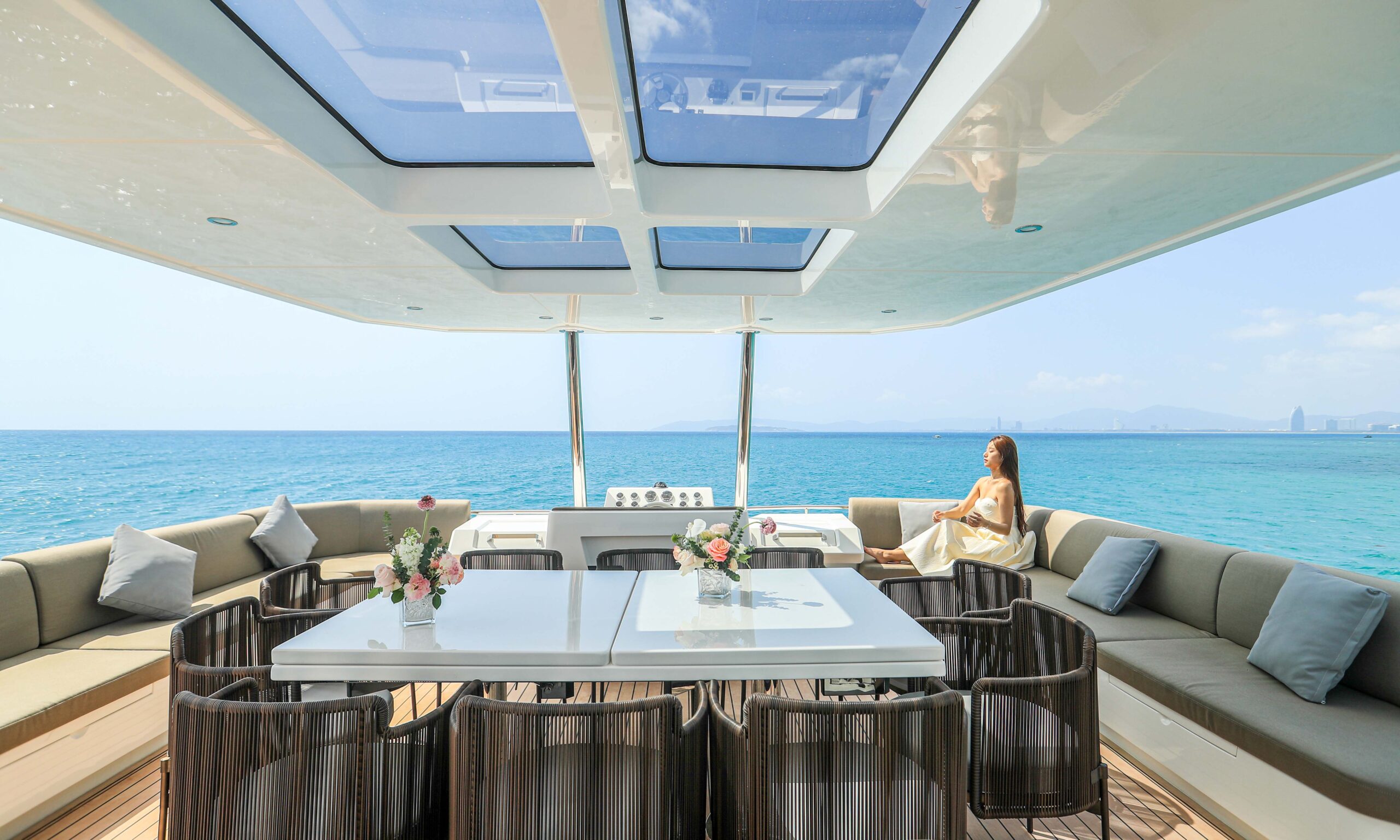 Private VIP Changing& Rest Suites, two full washrooms with separate wet rooms, exceptional sound insulation, expansive open-deck lounging, and a spacious flybridge with bar seating.
